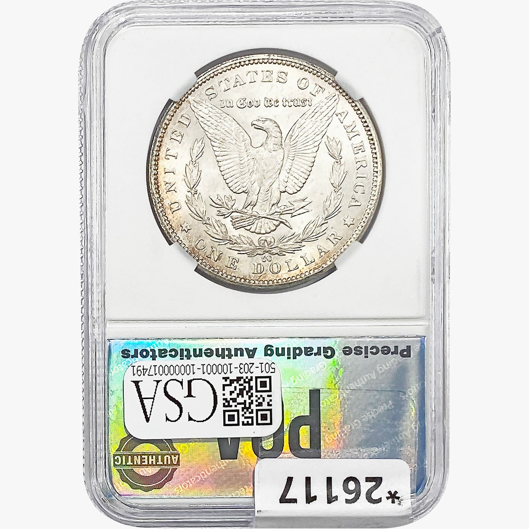 COINS AND CURRENCY LISTED IN GSA’S CATALOG AS GRADED AND ENCAPSULATED BY PCGS, NGC, ANACS, ICG, PCGS CURRENCY, PMG, PCGS BANKNOTE GRADING, CMC OR ANY OTHER THIRD-PARTY GRADING SERVICE ARE LIKEWISE SOLD “AS-IS” EXCEPT AS EXPRESSLY SET FORTH HEREIN. ALL THIRD-PARTY GRADING SERVICE GUARANTEES, INCLUDING AUTHENTICITY, ARE THE SOLE RESPONSIBILITY OF THE THIRD-PARTY GRADING SERVICE AND NOT WARRANTIES OR GUARANTEES OF GSA. BIDDERS SHOULD CONTACT THESE THIRD-PARTY GRADING SERVICES DIRECTLY WITH RESPECT TO ANY CLAIMS OR QUESTIONS THEY MAY HAVE CONCERNING THEIR GUARANTEES AND WARRANTIES. BIDDERS ACKNOWLEDGE AND AGREE THAT AUCTIONEER IS NOT BOUND BY OR LIABLE FOR ANY OPINION OR CERTIFICATION BY ANY THIRD-PARTY GRADING SERVICE. REMOVAL OF A PRODUCT FROM ITS PROTECTIVE CASING OR HOLDER OR ALTERATION OF ANY COIN HOLDER WAIVES ALL RIGHTS CONCERNING THE PRODUCT CONTAINED THEREIN.
