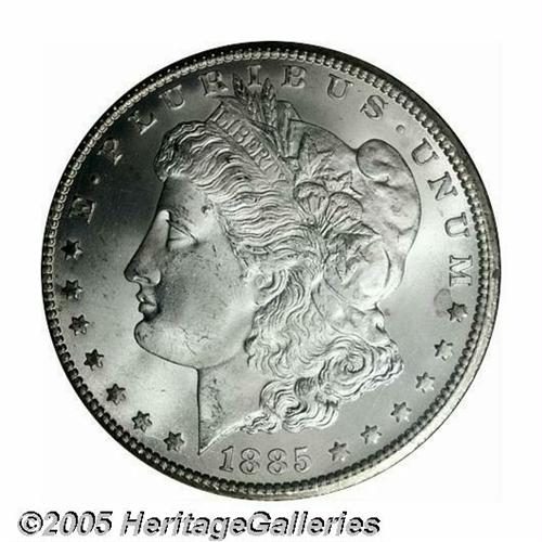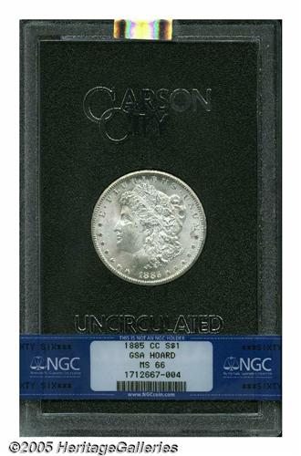 <B>1885-CC<S$1> Dollar MS66 NGC.</B></I> Brilliant and highly lustrous with strong striking definition on each side. Very few 1885-CC dollars qualify as Gem that are still in GSA holders.
