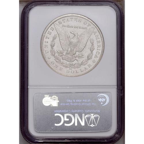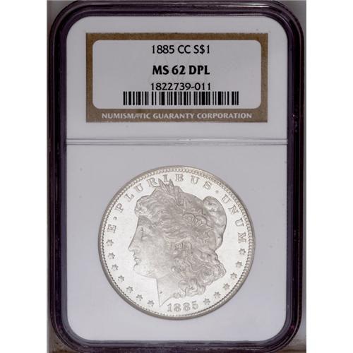 <B>1885-CC<img border='0' src='http://www.heritagecoins.com/images/star.gif' width=10 height=10>$1 MS62 Deep Mirror Prooflike NGC.</B></I> The design elements are well struck, except for softness on Liberty's hair and the eagle's breast, and present a strong contrast against the deeply mirrored fields. The grade is limited by numerous small contact marks mostly scattered over the obverse. Bright and untoned.