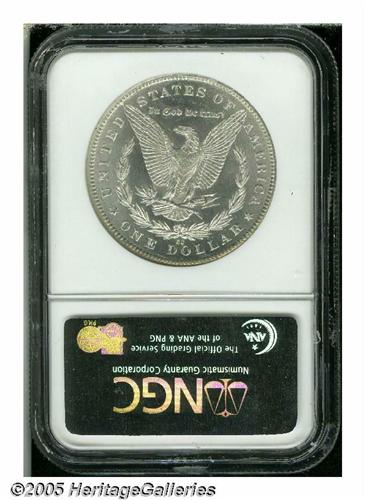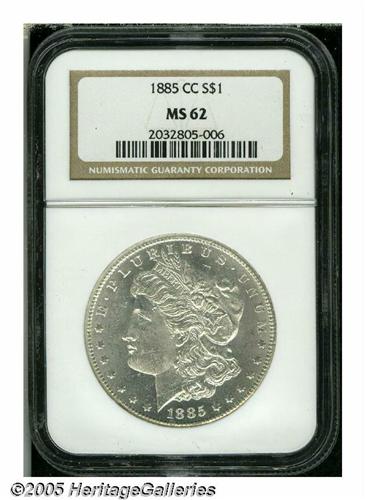 <B>1885-CC<S$1> MS62 NGC.</B></I> Untoned and boldly struck, with a combination of satiny and frosty luster, and pleasing details throughout. A mildly scuffy obverse appearance limits the grade, while the reverse seems well preserved, lightly abraded, and almost Gemlike.