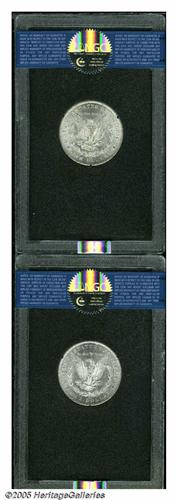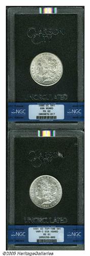 <B>1885-CC<S$1> MS62 NGC,</B></I> lustrous, bold, brilliant, a typically marked cheek; and an <B>1891-CC MS61 NGC,</B></I> VAM-3, A Top 100 Variety, brilliant, well struck, the cheek has numerous minor marks. Both GSA Dollars are accompanied by the box and certificates of issue.