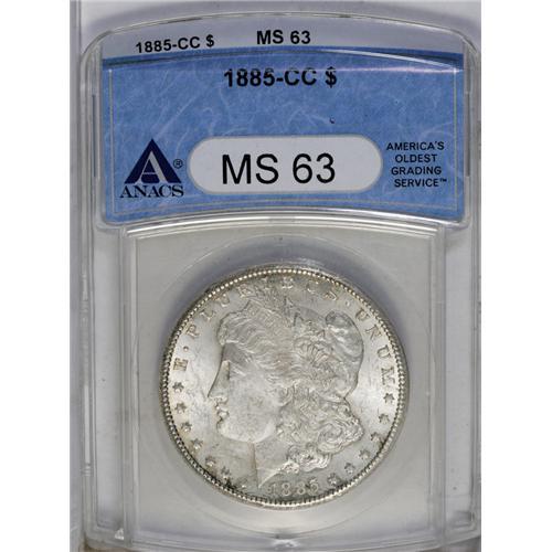 <B>1885-CC<img border='0' src='http://www.heritagecoins.com/images/star.gif' width=10 height=10>$1> MS63 ANACS.</B></I> Nicely struck and frosty with a clean reverse and a few luster grazes on the cheek. A lightly toned example of this popular, low mintage Carson City issue.