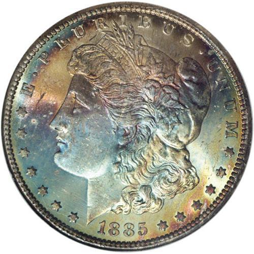 <B>1885-CC<img border='0' src='http://www.heritagecoins.com/images/star.gif' width=10 height=10>$1 MS63 <img border='0' src='http://www.heritagecoins.com/images/star.gif' width=10 height=10> NGC.</B></I> Colorfully toned over the obverse with variegated shades of sky-blue, turquoise-blue, antique-gold, and sunset-crimson. The reverse is essentially brilliant, save for a peripheral ring of reddish-golden and blue color. Typically marked on the obverse for the assigned grade.<BR><I>From The Diamond Collection, Part Two.</B></I>