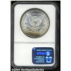<B>1885-CC<S$1> MS63 NGC.</B></I> Deep rainbow toning arcs along the upper obverse and the lower reverse, the remaining surfaces being untoned. The design elements on this Carson City dollar are well struck. A few light ticks on Liberty's cheek just barely keep this example from the next highest grade. <BR><BR><B>Important notice:</B> Heritage usually auctions material at the rate of 200-250 lots per hour. On some occasions eBay Live bid software or the Internet may not be able to keep up with the pace of the auction. We recommend placing a realistic absentee bid now as insurance to avoid disappointment. Occasionally the auctioneer may eliminate or reject an eBay Live bid, and the auctioneer may also reopen a lot after the close of the eBay live bidding (usually because we missed an audience bid), and may reject your bid even if it shows you as the winning bidder. By bidding via eBay Live, you agree that Heritage may award the lot to another bidder at its sole discretion under the circumstances described above or any other reasonable circumstances. Since eBay bids are not shown to us until we open the lot on the floor, we treat those bids just like floor bids. In most cases the floor responds before the eBay bid is presented to us, due to Internet lag time, so for consistency we have made it a policy that floor bids are always considered first over tie eBay live bids. Also please note that all Heritage lots purchased through eBay Live carry a 20% Buyer's Premium. Please make sure you read the Terms and Conditions before you bid.