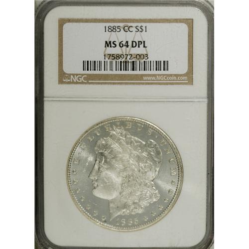 <B>1885-CC S$1 MS64 Deep Mirror Prooflike NGC.</B></I> A white-on-black near-Gem that benefits from a precise strike and attractive preservation. A flashy example of this popular low mintage Carson City date.<BR><BR><b>Shipping:</b> Coins & Currency (<a target="_blank" href="http://www.heritageauctions.com/common/shipping.php">view shipping information</a>)