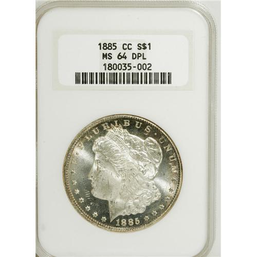 <B>1885-CC S$1 MS64 Deep Mirror Prooflike NGC.</B></I> Golden-brown and forest-green borders frame this well struck and flashy near-Gem. The fields are beautifully smooth, while the portrait has only wispy marks. Certified in an older generation holder.<BR><BR><b>Shipping:</b> Coins & Currency (<a target="_blank" href="http://www.heritageauctions.com/common/shipping.php">view shipping information</a>)