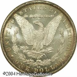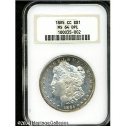1885-CC S$1 MS64 Deep Mirror Prooflike NGC. Nicely <B>1885-CC S$1 MS64 Deep Mirror Prooflike NGC.</B></I> Nicely reflective fields with frosted devices and deep brick-red and blue toning at the borders. Some contact marks are seen on Liberty's cheek and the left obverse field. <BR><BR><B>Important notice:</B> Heritage usually auctions material at the rate of 200-250 lots per hour. On some occasions eBay Live bid software or the Internet may not be able to keep up with the pace of the auction. We recommend placing a realistic absentee bid now as insurance to avoid disappointment. Occasionally the auctioneer may eliminate or reject an eBay Live bid, and the auctioneer may also reopen a lot after the close of the eBay live bidding (usually because we missed an audience bid), and may reject your bid even if it shows you as the winning bidder. By bidding via eBay Live, you agree that Heritage may award the lot to another bidder at its sole discretion under the circumstances described above or any other reasonable circumstances. Since eBay bids are not shown to us until we open the lot on the floor, we treat those bids just like floor bids. In most cases the floor responds before the eBay bid is presented to us, due to Internet lag time, so for consistency we have made it a policy that floor bids are always considered first over tie eBay live bids. Also please note that all Heritage lots purchased through eBay Live carry a 20% Buyer's Premium. Please make sure you read the Terms and Conditions before you bid. This lot is being auctioned in conjunction with a live floor auction by Heritage Galleries & Auctioneers. All final auction and invoice information will be supplied by Heritage Galleries & Auctioneers, and all other information should be considered preliminary. Lot:7508