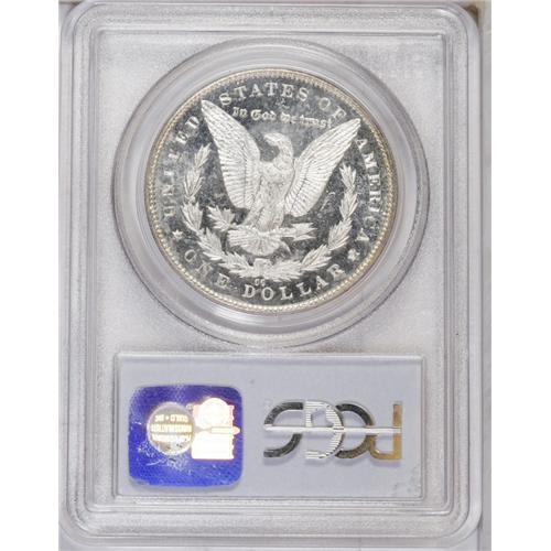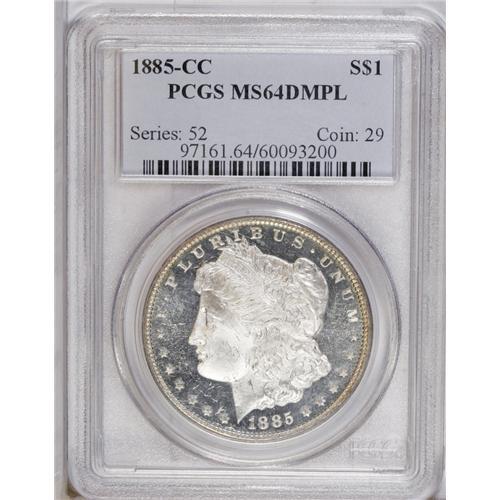 <B>1885-CC<img border='0' src='http://www.heritagecoins.com/images/star.gif' width=10 height=10>$1> MS64 Deep Mirror Prooflike PCGS.</B></I> A sparkling near-Gem with heavily frosted devices and intense mirrors. Champagne toning appears at the rims, and light haze floats upon the obverse fields.<BR><I>From The New York Eye Appeal Collection.</B></I>