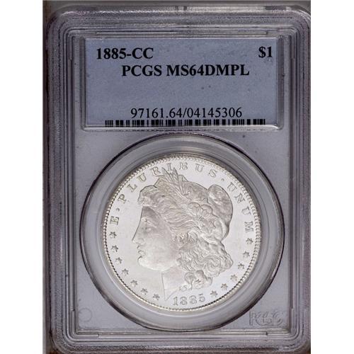 <B>1885-CC<img border='0' src='http://www.heritagecoins.com/images/star.gif' width=10 height=10>$1> MS64 Deep Mirror Prooflike PCGS.</B></I> Although the surfaces have considerable tiny marks, the overall eye appeal of this lovely example is impressive. Both sides are fully brilliant with deeply mirrored fields around frosty white devices. A delightful cameo example.