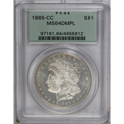 <B>1885-CC<img border='0' src='http://www.heritagecoins.com/images/star.gif' width=10 height=10>$1> MS64 Deep Mirror Prooflike PCGS.</B></I> Choice and boldly impressed with deep reflectivity and excellent contrast. The heavily frosted devices have few marks for the grade, though the fields are lightly abraded.
