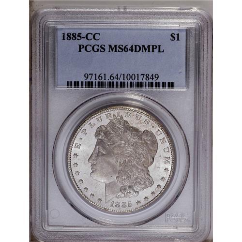 <B>1885-CC<img border='0' src='http://www.heritagecoins.com/images/star.gif' width=10 height=10>$1> MS64 Deep Mirror Prooflike PCGS.</B></I> Well struck with deeply prooflike fields and fully frosted devices. The few wispy marks in the fields are magnified by the glittering reflectivity of this attractive near-Gem.