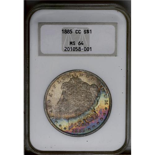 <B>1885-CC<img border='0' src='http://www.heritagecoins.com/images/star.gif' width=10 height=10>$1> MS64 NGC.</B></I> A lovely example with the obverse toned and the reverse essentially brilliant. The lower part of the obverse, in a wide crescent from 2 o'clock around to 8 o'clock, has bands of rainbow iridescence consisting of blue, yellow, lilac, and sea-green color. Above this is golden-brown color across the remaining obverse surface. The reverse has faint peripheral gold color. <BR><BR><B>Important notice:</B> Heritage usually auctions material at the rate of 200-250 lots per hour. On some occasions eBay Live bid software or the Internet may not be able to keep up with the pace of the auction. We recommend placing a realistic absentee bid now as insurance to avoid disappointment. Occasionally the auctioneer may eliminate or reject an eBay Live bid, and the auctioneer may also reopen a lot after the close of the eBay live bidding (usually because we missed an audience bid), and may reject your bid even if it shows you as the winning bidder. By bidding via eBay Live, you agree that Heritage may award the lot to another bidder at its sole discretion under the circumstances described above or any other reasonable circumstances. Since eBay bids are not shown to us until we open the lot on the floor, we treat those bids just like floor bids. In most cases the floor responds before the eBay bid is presented to us, due to Internet lag time, so for consistency we have made it a policy that floor bids are always considered first over tie eBay live bids. Also please note that all Heritage lots purchased through eBay Live carry a 20% Buyer's Premium. Please make sure you read the Terms and Conditions before you bid. This lot is being auctioned in conjunction with a live floor auction by Heritage Galleries & Auctioneers. All final auction and invoice information will be supplied by Heritage Galleries & Auctioneers, and all other information should be considered preliminary. Lot:3428 <BR><BR><B>Winning Notification and Billing:</B> After the FINAL session in this auction is complete, Heritage will send e-mail and snail mail invoices. This process normally takes several days. All final auction and invoice information will be supplied by Heritage Galleries & Auctioneers, and all other information should be considered preliminary. <BR><BR>This auction will be conducted on a live auction floor and over the Internet through eBay Live. If you choose to place an absentee bid, please take a moment to <font color='#0000ff'><u><a href='http://pages.ebay.com/liveauctions/help/before/laabsentee.html'>learn how eBay Live absentee bidding works</a></u></font><font color='#000000'>