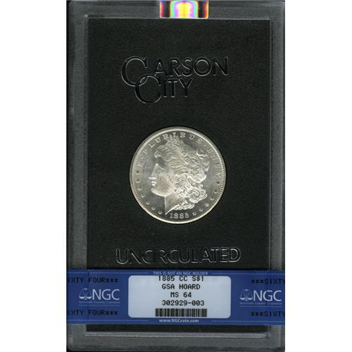 <B>1885-CC<img border='0' src='http://www.heritagecoins.com/images/star.gif' width=10 height=10>$1> MS64 NGC.</B></I> A semi-prooflike near-Gem with only faint gold toning. Nicely struck, and the fields are well preserved. Accompanied by the GSA box and certificate of issue. The certificate has the handwritten notation, "1885-CC/purchased/9-23-80 200.00."