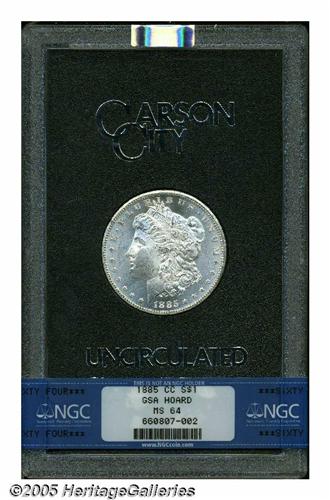 <B>1885-CC<S$1> MS64 NGC.</B></I> Both obverse and reverse are fully brilliant with frosty silver luster. Lightly marked as expected. This is a lovely example that nearly reaches the Gem category.