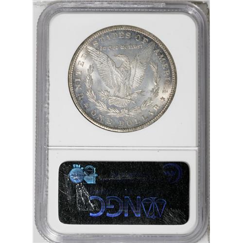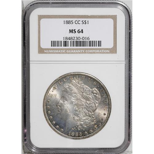 <B>1885-CC<img border='0' src='http://www.heritagecoins.com/images/star.gif' width=10 height=10>$1> MS64 NGC.</B></I> Both sides of this lustrous near-Gem are lightly and evenly coated with a thin pink-champagne patina. The usual strike softness reveals some roller marks above the ear, and a few ticks on the cheek are noted.