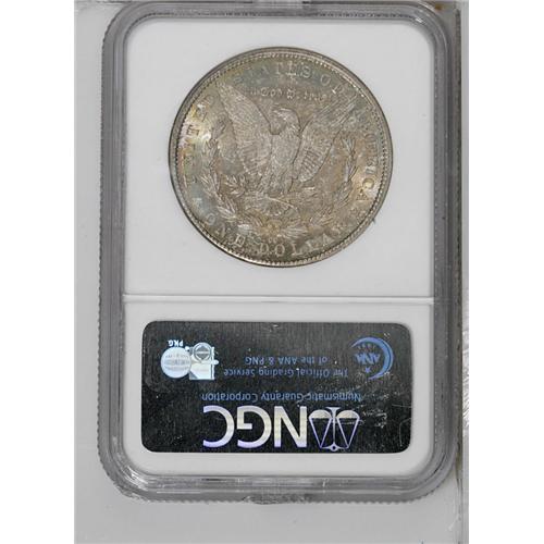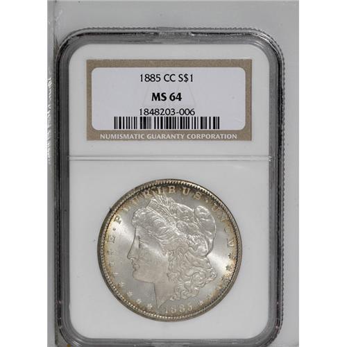 <B>1885-CC<img border='0' src='http://www.heritagecoins.com/images/star.gif' width=10 height=10>$1> MS64 NGC.</B></I> Mottled bronze and lavender toning covers the reverse but is confined to the periphery on the obverse. Nicely struck, though it has somewhat subdued luster and a few abrasions in prime focal areas.