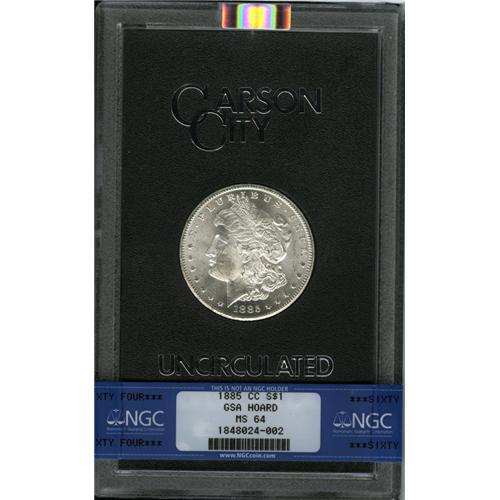 <B>1885-CC<img border='0' src='http://www.heritagecoins.com/images/star.gif' width=10 height=10>$1> MS64 NGC.</B></I> This beautiful, pinpoint-sharp Choice Carson City dollar displays dazzling luster, and the clean surfaces approach the quality of a higher grade. Accompanied by a black GSA box.