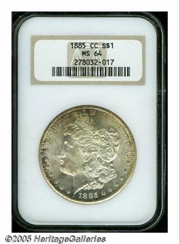 <B>1885-CC<S$1> MS64 NGC.</B></I> This is a lovely example with brilliant and frosty silver luster accented by light gold and iridescent toning at the borders. The surfaces are very lightly abraded, limiting the grade of this Choice Mint State example.<BR><I>From The Stig Ericsson Collection.</B></I>