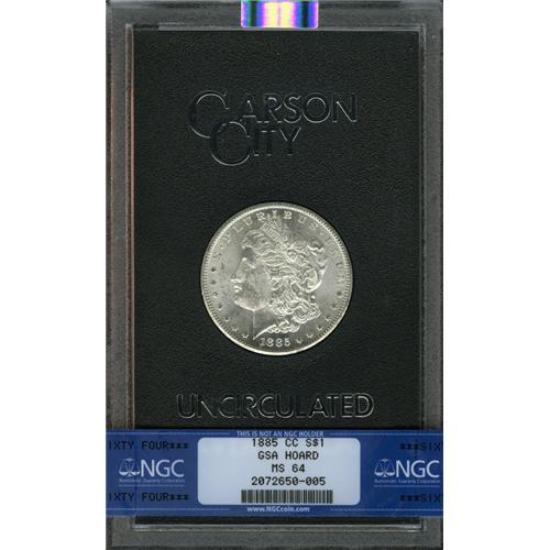<B>1885-CC S$1 MS64 NGC.</B></I> This lustrous low mintage Carson City GSA dollar has a well preserved reverse. The faintly toned obverse is clean save for a few wispy grazes on the cheek. The box of issue accompanies the lot.<BR><BR><b>Shipping:</b> Coins & Currency (<a target="_blank" href="http://www.heritageauctions.com/common/shipping.php">view shipping information</a>)