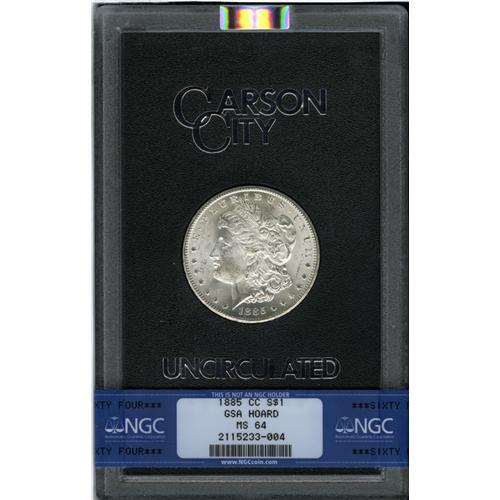 <B>1885-CC<img border='0' src='http://www.heritagecoins.com/images/star.gif' width=10 height=10>$1> MS64 NGC.</B></I> This nearly fully brilliant Choice Carson City dollar features potent luster and a good strike. The reverse field is particularly undisturbed. The certificate and black box of GSA issue accompany the lot.