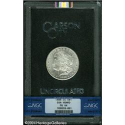 1885-CC S$1 MS64 NGC. Traces of tan color visit th <B>1885-CC S$1 MS64 NGC.</B></I> Traces of tan color visit this lustrous and sharply struck low mintage Dollar. A quality selection for the collector who covets originality. <BR><BR><B>Important notice:</B> Heritage usually auctions material at the rate of 200-250 lots per hour. On some occasions eBay Live bid software or the Internet may not be able to keep up with the pace of the auction. We recommend placing a realistic absentee bid now as insurance to avoid disappointment. Occasionally the auctioneer may eliminate or reject an eBay Live bid, and the auctioneer may also reopen a lot after the close of the eBay live bidding (usually because we missed an audience bid), and may reject your bid even if it shows you as the winning bidder. By bidding via eBay Live, you agree that Heritage may award the lot to another bidder at its sole discretion under the circumstances described above or any other reasonable circumstances. Since eBay bids are not shown to us until we open the lot on the floor, we treat those bids just like floor bids. In most cases the floor responds before the eBay bid is presented to us, due to Internet lag time, so for consistency we have made it a policy that floor bids are always considered first over tie eBay live bids. Also please note that all Heritage lots purchased through eBay Live carry a 20% Buyer's Premium. Please make sure you read the Terms and Conditions before you bid. This lot is being auctioned in conjunction with a live floor auction by Heritage Galleries & Auctioneers. All final auction and invoice information will be supplied by Heritage Galleries & Auctioneers, and all other information should be considered preliminary. Lot:8109