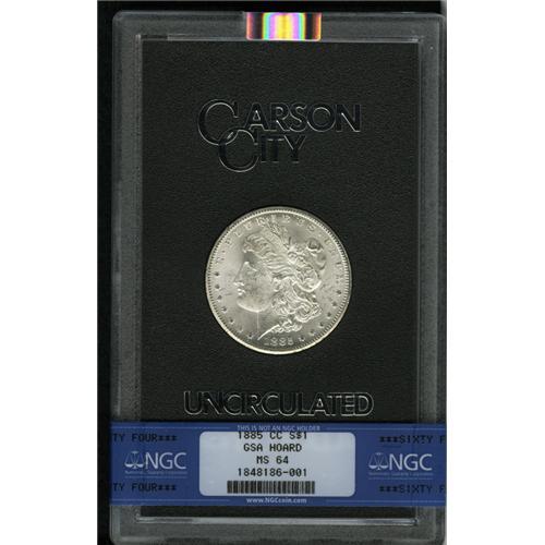 <B>1885-CC<img border='0' src='http://www.heritagecoins.com/images/star.gif' width=10 height=10>$1> MS64 NGC.</B></I> Wisps of gray toning deny full brilliance, but this lustrous and suitably struck low mintage CC-mint dollar has an unusually clean reverse field. The cheek displays faint grazes. The GSA box of issue accompanies.