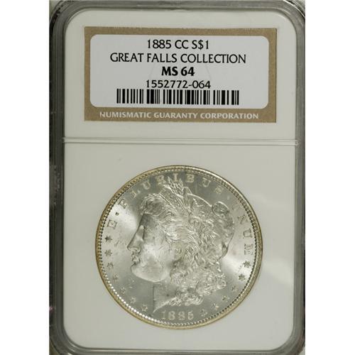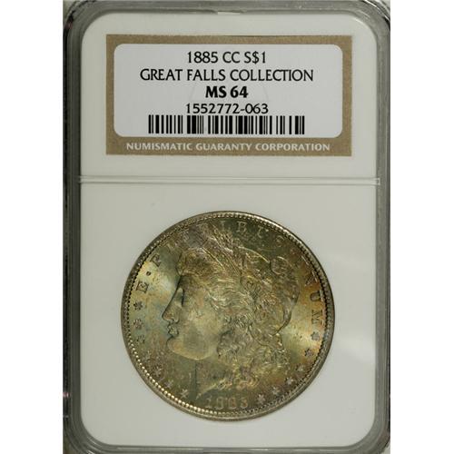 <B>1885-CC S$1 MS64 NGC,</B></I> pastel red-orange and olive shadings enrich the obverse; and an <B>1885-CC MS64 NGC,</B></I> honey-gold and sky-blue invigorate the reverse.<BR><I>From The Great Falls Collection.</B></I><BR><BR><b>Shipping:</b> Coins & Currency (<a target="_blank" href="http://www.heritageauctions.com/common/shipping.php">view shipping information</a>)
