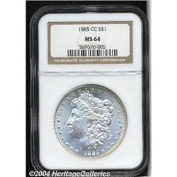 <B>1885-CC<S$1> MS64 NGC.</B></I> Nearly untoned, save for a hint of color around some of the margins. Well struck, except for softness in the hair over Liberty's ear. A few light marks on Liberty's cheek and neck limit the grade. <BR><BR><B>Important notice:</B> Heritage usually auctions material at the rate of 200-250 lots per hour. On some occasions eBay Live bid software or the Internet may not be able to keep up with the pace of the auction. We recommend placing a realistic absentee bid now as insurance to avoid disappointment. Occasionally the auctioneer may eliminate or reject an eBay Live bid, and the auctioneer may also reopen a lot after the close of the eBay live bidding (usually because we missed an audience bid), and may reject your bid even if it shows you as the winning bidder. By bidding via eBay Live, you agree that Heritage may award the lot to another bidder at its sole discretion under the circumstances described above or any other reasonable circumstances. Since eBay bids are not shown to us until we open the lot on the floor, we treat those bids just like floor bids. In most cases the floor responds before the eBay bid is presented to us, due to Internet lag time, so for consistency we have made it a policy that floor bids are always considered first over tie eBay live bids. Also please note that all Heritage lots purchased through eBay Live carry a 20% Buyer's Premium. Please make sure you read the Terms and Conditions before you bid. </span></font></tr></table></td></tr></table>