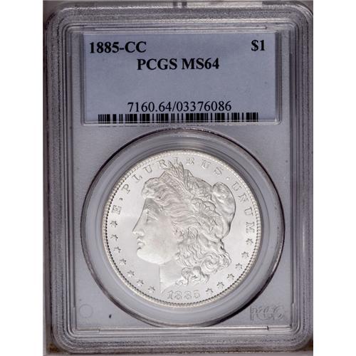 <B>1885-CC<img border='0' src='http://www.heritagecoins.com/images/star.gif' width=10 height=10>$1> MS64 PCGS.</B></I> A boldly struck and frosty near-Gem of this popular CC-mint issue, kept from a higher grade by a few stray abrasions on the cheek and in the reverse fields. Appealing nonetheless. <BR><BR><B>Important notice:</B> Heritage usually auctions material at the rate of 200-250 lots per hour. On some occasions eBay Live bid software or the Internet may not be able to keep up with the pace of the auction. We recommend placing a realistic absentee bid now as insurance to avoid disappointment. Occasionally the auctioneer may eliminate or reject an eBay Live bid, and the auctioneer may also reopen a lot after the close of the eBay live bidding (usually because we missed an audience bid), and may reject your bid even if it shows you as the winning bidder. By bidding via eBay Live, you agree that Heritage may award the lot to another bidder at its sole discretion under the circumstances described above or any other reasonable circumstances. Since eBay bids are not shown to us until we open the lot on the floor, we treat those bids just like floor bids. In most cases the floor responds before the eBay bid is presented to us, due to Internet lag time, so for consistency we have made it a policy that floor bids are always considered first over tie eBay live bids. Also please note that all Heritage lots purchased through eBay Live carry a 20% Buyer's Premium. Please make sure you read the Terms and Conditions before you bid. This lot is being auctioned in conjunction with a live floor auction by Heritage Galleries & Auctioneers. All final auction and invoice information will be supplied by Heritage Galleries & Auctioneers, and all other information should be considered preliminary. Lot:3424 <BR><BR><B>Winning Notification and Billing:</B> After the FINAL session in this auction is complete, Heritage will send e-mail and snail mail invoices. This process normally takes several days. All final auction and invoice information will be supplied by Heritage Galleries & Auctioneers, and all other information should be considered preliminary. <BR><BR>This auction will be conducted on a live auction floor and over the Internet through eBay Live. If you choose to place an absentee bid, please take a moment to <font color='#0000ff'><u><a href='http://pages.ebay.com/liveauctions/help/before/laabsentee.html'>learn how eBay Live absentee bidding works</a></u></font><font color='#000000'>