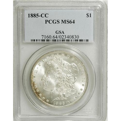 <B>1885-CC S$1 MS64 PCGS.</B></I> Ex: GSA. Sea-green, golden-brown, and rose-red endow the left borders, particularly on the reverse. This crisply struck and lustrous near-Gem has clean fields and only minor facial grazes.<BR><BR><b>Shipping:</b> Coins & Currency (<a target="_blank" href="http://www.heritageauctions.com/common/shipping.php">view shipping information</a>)