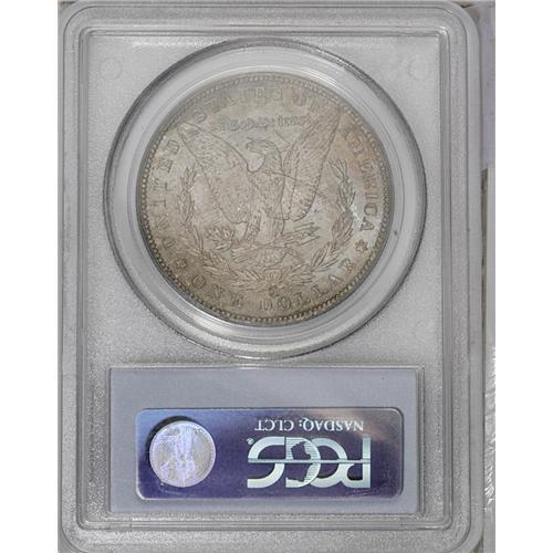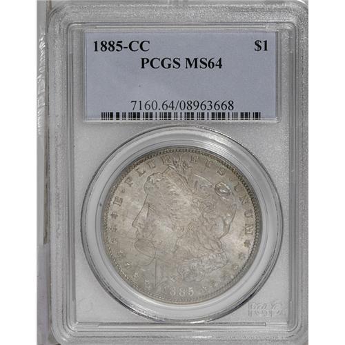 <B>1885-CC<img border='0' src='http://www.heritagecoins.com/images/star.gif' width=10 height=10>$1> MS64 PCGS.</B></I> Streaks of subdued violet and orange toning cover this piece's subtly lustrous surfaces. Sharply struck with some small abrasions that limit the grade.