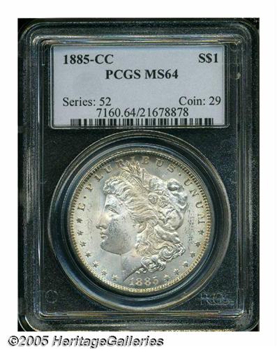 <B>1885-CC<S$1> MS64 PCGS.</B></I> The chestnut patina is most prominent on the obverse of this nicely struck and highly lustrous near-Gem. A few minor grazes on the cheek and right obverse field, while the reverse is well preserved.
