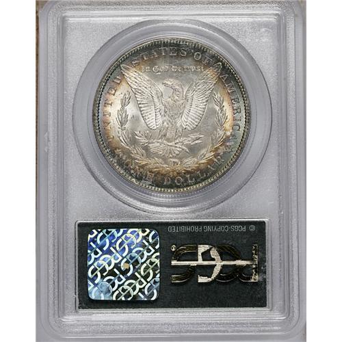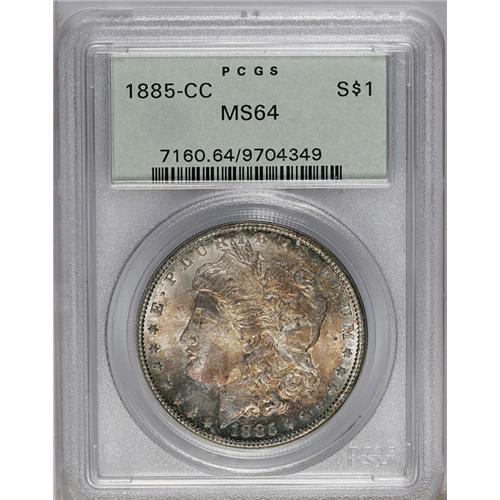 <B>1885-CC<img border='0' src='http://www.heritagecoins.com/images/star.gif' width=10 height=10>$1> MS64 PCGS.</B></I> The reverse has concentric orange, russet, and blue toning around an untoned center, while the obverse has the same colors in less organized patterns. Nicely struck with great luster and just a few too many marks to qualify as a Gem.