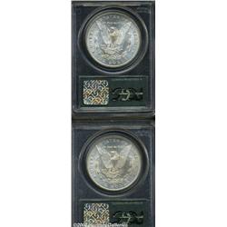 <B>1885-CC<S$1> MS64 PCGS,</B></I> crescents of multicolored toning along the right obverse border complement orange coloration on the remaining obverse surfaces, and a nearly untoned reverse; and an <B>1885-CC MS64 PCGS,</B></I> crescents of aqua, violet, and orange color at the right obverse border, with the remaining surfaces largely untoned.<BR><I>From The Velma & Bowie Lynch Collection, Part Four.</B></I> 2 Coins <BR><BR><B>Important notice:</B> Heritage usually auctions material at the rate of 200-250 lots per hour. On some occasions eBay Live bid software or the Internet may not be able to keep up with the pace of the auction. We recommend placing a realistic absentee bid now as insurance to avoid disappointment. Occasionally the auctioneer may eliminate or reject an eBay Live bid, and the auctioneer may also reopen a lot after the close of the eBay live bidding (usually because we missed an audience bid), and may reject your bid even if it shows you as the winning bidder. By bidding via eBay Live, you agree that Heritage may award the lot to another bidder at its sole discretion under the circumstances described above or any other reasonable circumstances. Since eBay bids are not shown to us until we open the lot on the floor, we treat those bids just like floor bids. In most cases the floor responds before the eBay bid is presented to us, due to Internet lag time, so for consistency we have made it a policy that floor bids are always considered first over tie eBay live bids. Also please note that all Heritage lots purchased through eBay Live carry a 20% Buyer's Premium. Please make sure you read the Terms and Conditions before you bid. </span></font></tr></table></td></tr></table>