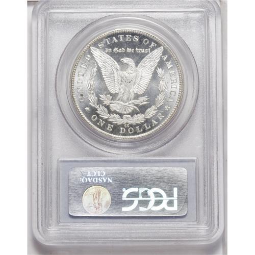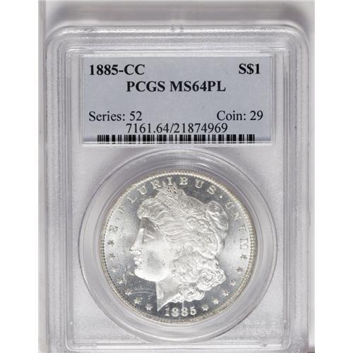 <B>1885-CC<img border='0' src='http://www.heritagecoins.com/images/star.gif' width=10 height=10>$1> MS64 Prooflike PCGS.</B></I> A moderately reflective and meticulously struck example. The reverse is unmarked but has a small brown spot between the UN in UNITED.