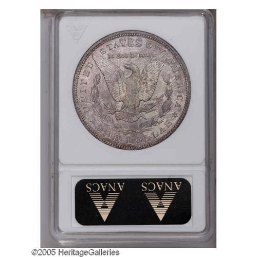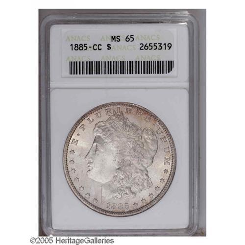 <B>1885-CC<S$1> MS65 ANACS.</B></I> Well struck and highly lustrous, with dappled apricot-red and greenish-gray toning on the reverse, a shallow luster graze in the left obverse field, and a couple of small contact marks on the eagle's breast.