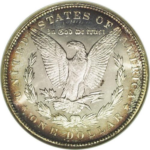 <B>1885-CC<img border='0' src='http://www.heritagecoins.com/images/star.gif' width=10 height=10>$1> MS65 Deep Mirror Prooflike NGC.</B></I> Sharply struck with gorgeous purple-russet and golden-brown toning near the edges and flashy, deeply reflective, watery fields. A few small marks on each side are all that prevent an even loftier grade designation. Always a popular coin because of its low mintage of 228,000 pieces, the '85-CC can often be found in high grades and is a relatively affordable Carson City dollar. Census: 68 in 65 Deep Mirror Prooflike, 17 finer (6/06).