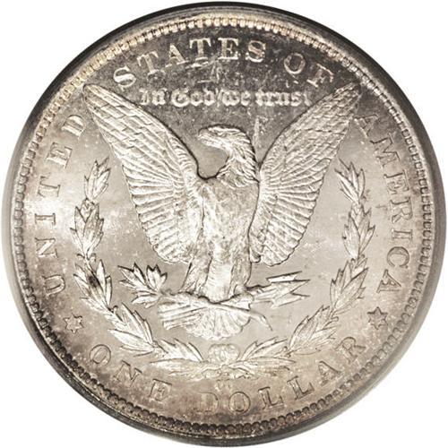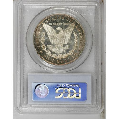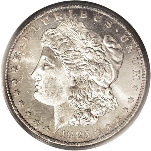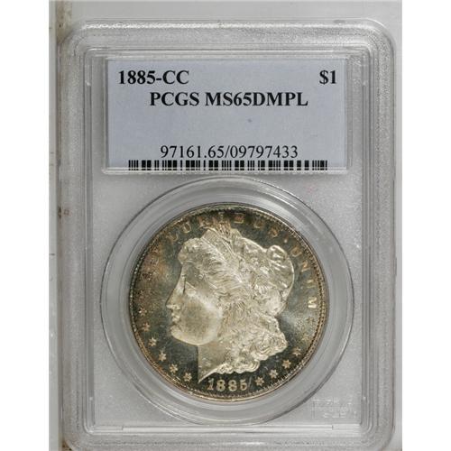 <B>1885-CC<img border='0' src='http://www.heritagecoins.com/images/star.gif' width=10 height=10>$1> MS65 Deep Mirror Prooflike PCGS.</B></I> An incredibly appealing example of this popular issue, with a light golden cast that deepens to russet and electric blue at the rims. The toning, however, is sufficiently light throughout to allow the viewer to appreciate the unencumbered radiance that emanates from pristine fields. Liberty's cheek is especially clean, although a reeding mark that proceeds upward from the back of the eagle's neck requires mention. PCGS has graded only 52 pieces finer (9/06).