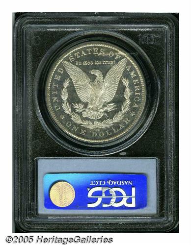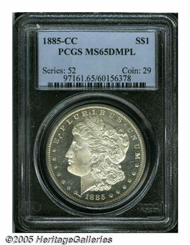 <B>1885-CC<S$1> MS65 Deep Mirror Prooflike PCGS.</B></I> Fully brilliant surfaces. The frosty design elements contrast boldly with the glittering mirror fields. A touch of striking softness is noted above Liberty's ear, but most other design features show bold definition. Close examination reveals some mint-caused planchet striations across Liberty's cheek and hair.