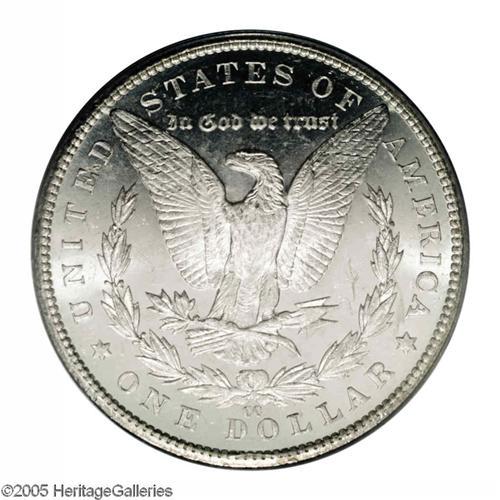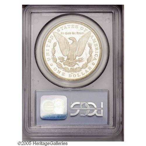 <B>1885-CC<S$1> MS65 Deep Mirror Prooflike PCGS.</B></I> Traces of golden color visit this primarily untoned Gem. The lightly marked fields exhibit pleasing reflectivity. Faint mint-made roller marks are present above the ear, but the strike is generally crisp. A clean cheek and gently frosted devices further adds to the eye appeal.