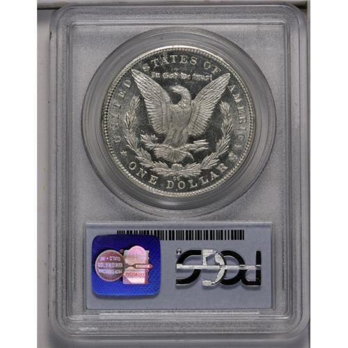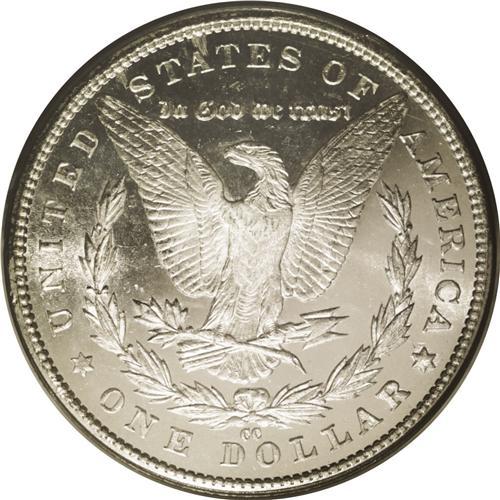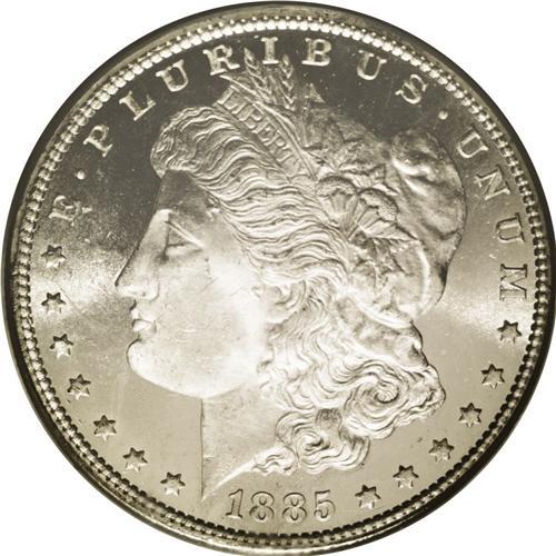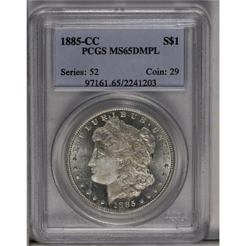 <B>1885-CC<img border='0' src='http://www.heritagecoins.com/images/star.gif' width=10 height=10>$1> MS65 Deep Mirror Prooflike PCGS.</B></I> With no toning on either side, the boldly cameoed finish is readily evident at all angles. Sharply struck with a couple of wispy abrasions and milling marks on the obverse.