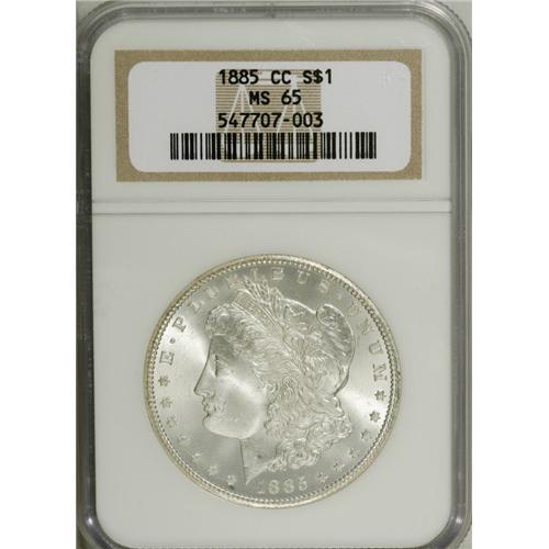 <B>1885-CC S$1 MS65 NGC.</B></I> Highly lustrous fields and frosty devices are the hallmarks of this attractive Carson City Gem. While such examples are legion in the <I>Census Report,</B></I> few such pieces have the overall eye appeal of this coin.<BR><BR><b>Shipping:</b> Coins & Currency (<a target="_blank" href="http://www.heritageauctions.com/common/shipping.php">view shipping information</a>)