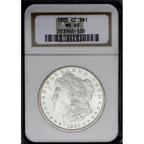 <B>1885-CC<img border='0' src='http://www.heritagecoins.com/images/star.gif' width=10 height=10>$1> MS65 NGC.</B></I> Snow-white mint frost with a bold strike and a few light contact marks that do not seem excessive for the grade. <BR><BR><B>Important notice:</B> Heritage usually auctions material at the rate of 200-250 lots per hour. On some occasions eBay Live bid software or the Internet may not be able to keep up with the pace of the auction. We recommend placing a realistic absentee bid now as insurance to avoid disappointment. Occasionally the auctioneer may eliminate or reject an eBay Live bid, and the auctioneer may also reopen a lot after the close of the eBay live bidding (usually because we missed an audience bid), and may reject your bid even if it shows you as the winning bidder. By bidding via eBay Live, you agree that Heritage may award the lot to another bidder at its sole discretion under the circumstances described above or any other reasonable circumstances. Since eBay bids are not shown to us until we open the lot on the floor, we treat those bids just like floor bids. In most cases the floor responds before the eBay bid is presented to us, due to Internet lag time, so for consistency we have made it a policy that floor bids are always considered first over tie eBay live bids. Also please note that all Heritage lots purchased through eBay Live carry a 20% Buyer's Premium. Please make sure you read the Terms and Conditions before you bid. This lot is being auctioned in conjunction with a live floor auction by Heritage Galleries & Auctioneers. All final auction and invoice information will be supplied by Heritage Galleries & Auctioneers, and all other information should be considered preliminary. Lot:3433 <BR><BR><B>Winning Notification and Billing:</B> After the FINAL session in this auction is complete, Heritage will send e-mail and snail mail invoices. This process normally takes several days. All final auction and invoice information will be supplied by Heritage Galleries & Auctioneers, and all other information should be considered preliminary. <BR><BR>This auction will be conducted on a live auction floor and over the Internet through eBay Live. If you choose to place an absentee bid, please take a moment to <font color='#0000ff'><u><a href='http://pages.ebay.com/liveauctions/help/before/laabsentee.html'>learn how eBay Live absentee bidding works</a></u></font><font color='#000000'>