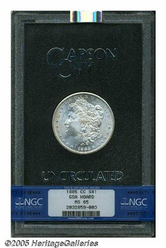 <B>1885-CC<S$1> MS65 NGC.</B></I> Wisps of chestnut and steel-gray color deny full brilliance. A pleasing representative of this popular low mintage issue. From a good strike, but not needle-sharp.
