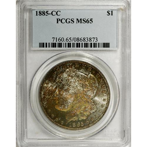 <B>1885-CC S$1 MS65 PCGS.</B></I> A colorful Gem that has modest reflectivity on the reverse. The dappled gold and silver-blue of the obverse is confined to the periphery on the other side.<BR><BR><b>Shipping:</b> Coin/Currency (<a target="_blank" href="http://www.heritageauctions.com/common/shipping.php">view shipping information</a>)