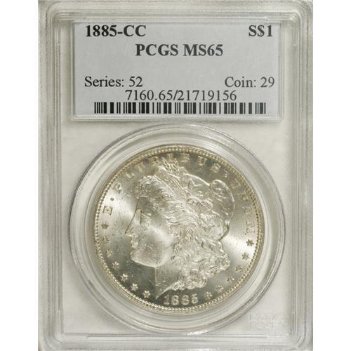 <B>1885-CC S$1 MS65 PCGS.</B></I> A highly lustrous Gem example of this popular Carson City dollar that has light frost on the devices. In spite of a small mintage of 228,000 pieces, this issue was saved in quantity for nearly a century, and many high-grade examples are available for collectors.<BR><BR><b>Shipping:</b> Coins & Currency (<a target="_blank" href="http://www.heritageauctions.com/common/shipping.php">view shipping information</a>)