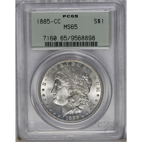 <B>1885-CC<img border='0' src='http://www.heritagecoins.com/images/star.gif' width=10 height=10>$1> MS65 PCGS.</B></I> An attractive Gem of this low mintage date, with virtually untoned, highly lustrous surfaces. Well struck with slight frostiness on the eagle, though light marks in the field restrict the grade.