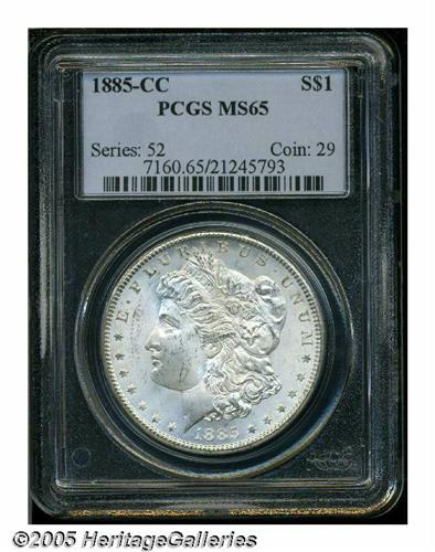 <B>1885-CC<S$1> MS65 PCGS.</B></I> Appealing frosty-grey Gem with appealing luster and no particularly distracting abrasions.