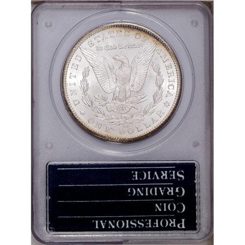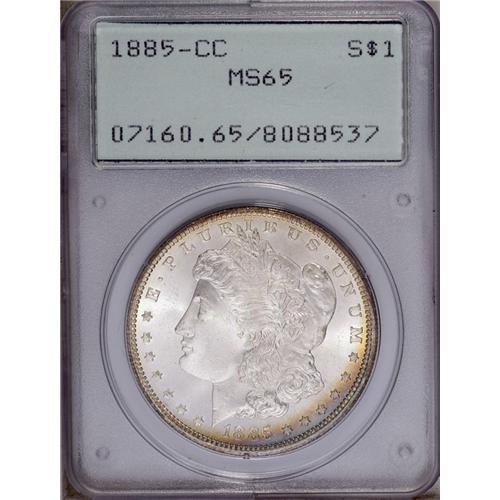 <B>1885-CC<img border='0' src='http://www.heritagecoins.com/images/star.gif' width=10 height=10>$1> MS65 PCGS.</B></I> Housed in a first-generation PCGS holder, this lovely Gem has fully brilliant silver surfaces accented by a thin crescent of gold and iridescent toning from 3 to 6 o'clock on the obverse.
