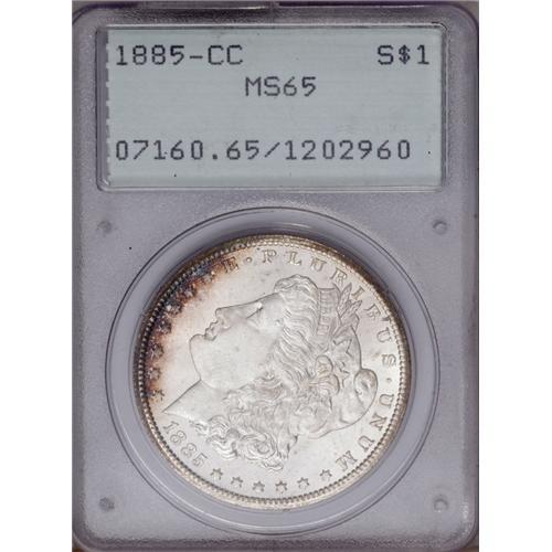 <B>1885-CC<img border='0' src='http://www.heritagecoins.com/images/star.gif' width=10 height=10>$1 MS65 PCGS.</B></I> Housed in a first generation holder, this low mintage Carson City dollar is lustrous and suitably struck. Hints of russet, mauve, and forest-green color cling to the left borders.